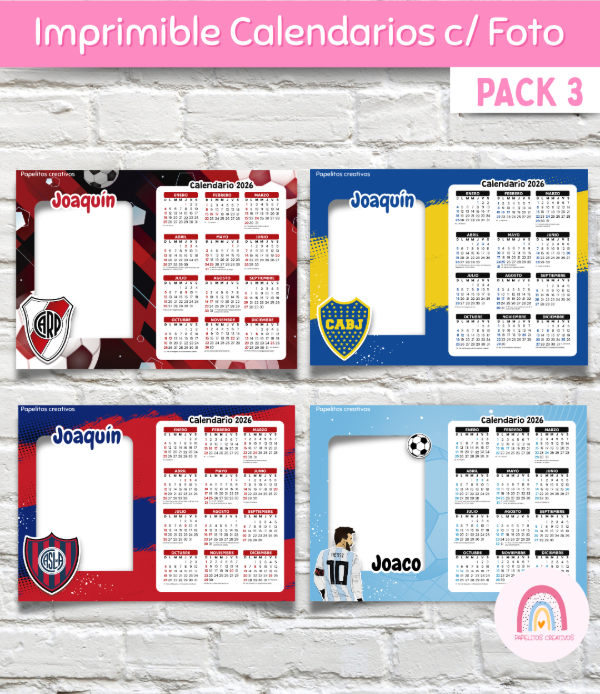 Incluye 12 calendarios con foto en hojas tamaño A4, con diseños de: